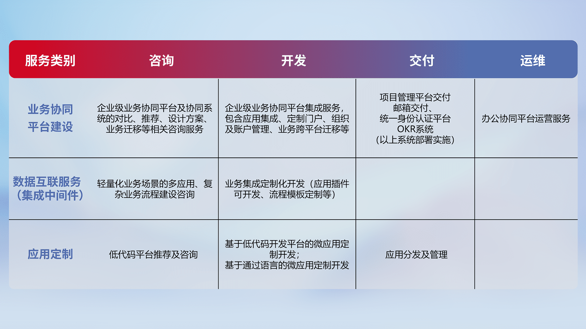 针对钉钉、、、企微、、IDaas等平台级产品提供产品的规划、、方案、、交付、、、定制化开发等服务,,,实现如统一协同办公、、智能客户服务、、、混合会议管理、、、、智能数据查询、、、、等业务场景,,实现数字化转型。。。