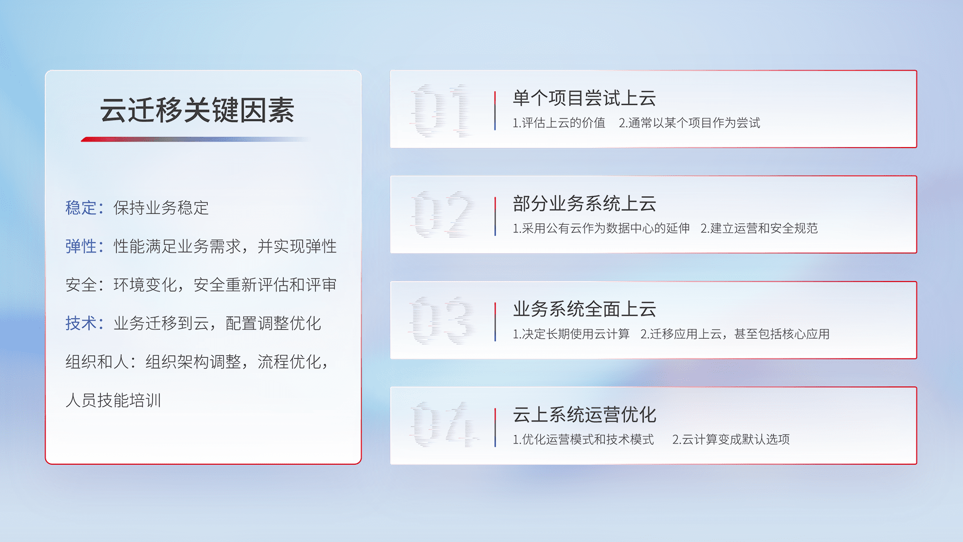 结合实际业务,,,从规划设计、、云平台选型、、云原生改造、、、数据迁移、、集成交付,,,迁移全过程为客户识别最佳上云路径,,做好风险识别管理,,,,设计网络架构、、身份权限、、安全审计合规、、操作审计、、日志审计、、、监控告警策略、、、多站点容灾设计等,,对云上基础设施进行整体规划,,提升IT治理水平,,,以满足弹性、、高可用、、、、高性能的需求。。。
