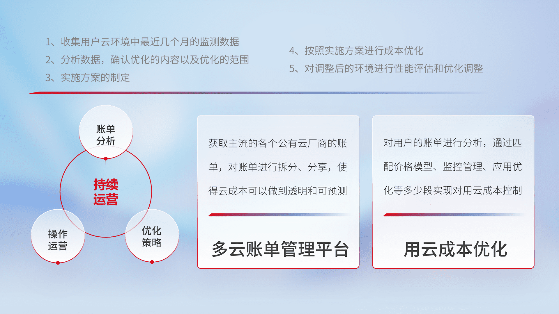 通过多云纳管,,,以统一的资源数据模型把客户的云资源进行抽象和封装,,进而实现对多云资源的统一操作,,,,保障云资源管理的可靠性、、、、稳定性与可用性。。。量身定制化运维内容,,,,配置、、、开发运维、、补丁管理、、、、备份、、监控、、、、认证和访问管理、、、、审计和日常巡检等,,,保障在用云过程中的可靠度,,,,稳定度以及高可用率。。